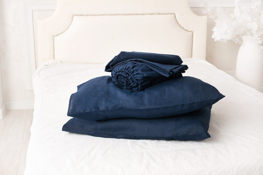 Deep blue linen bedding: Fitted sheet, Flat sheet, Pillowcase or Set