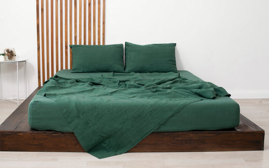 Green linen bedding: Fitted sheet, Flat sheet, Pillowcase or Set